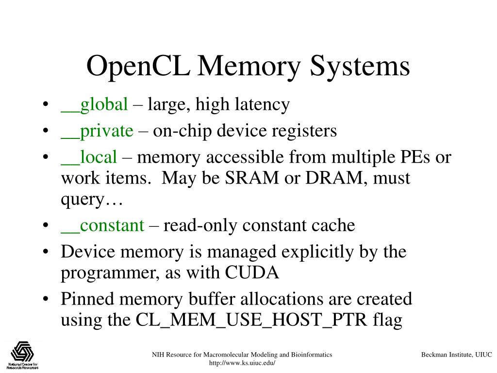 OpenCL Memory Systems • __global – large, high latency • __private – on-chip device registers • __local – memory accessible from multiple PEs or work items. May be SRAM or DRAM, must query… • __constant – read-only constant cache • Device memory is managed explicitly by the programmer, as with CUDA • Pinned memory buffer allocations are created using the CL_MEM_USE_HOST_PTR flag