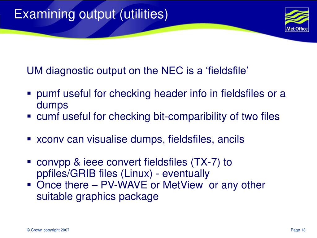 Examining output (utilities) UM diagnostic output on the NEC is a ‘fieldsfile’ • pumf useful for checking header info in fieldsfiles or a dumps • cumf useful for checking bit-comparibility of two files • xconv can visualise dumps, fieldsfiles, ancils • convpp & ieee convert fieldsfiles (TX-7) to ppfiles/GRIB files (Linux) - eventually • Once there – PV-WAVE or MetView or any other suitable graphics package