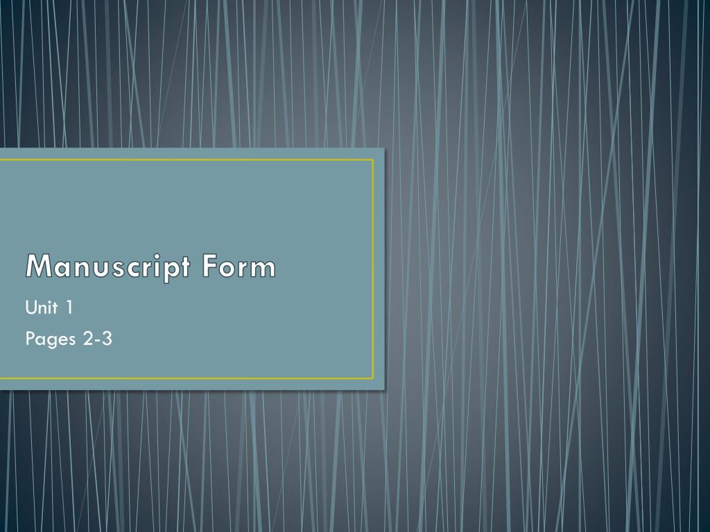 Manuscript Form. Unit 1 Pages 2-3. What is Manuscript Form?. Standards for writing pieces; required for all work in this class Clean, good quality, white paper Only use one side of the paper Respect the margins, they should be approximately one-inch on each side