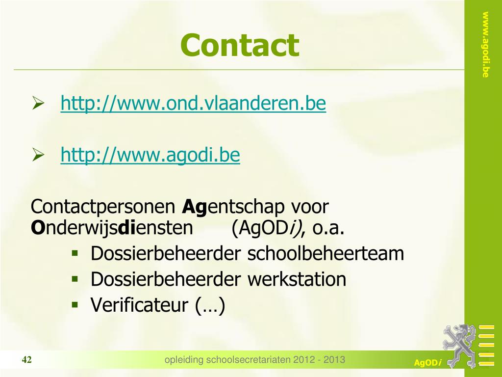 Contact • http://www.ond.vlaanderen.be • http://www.agodi.be Contactpersonen Agentschap voor Onderwijsdiensten (AgODi), o.a. • Dossierbeheerder schoolbeheerteam • Dossierbeheerder werkstation • Verificateur (…) opleiding schoolsecretariaten 2012 - 2013