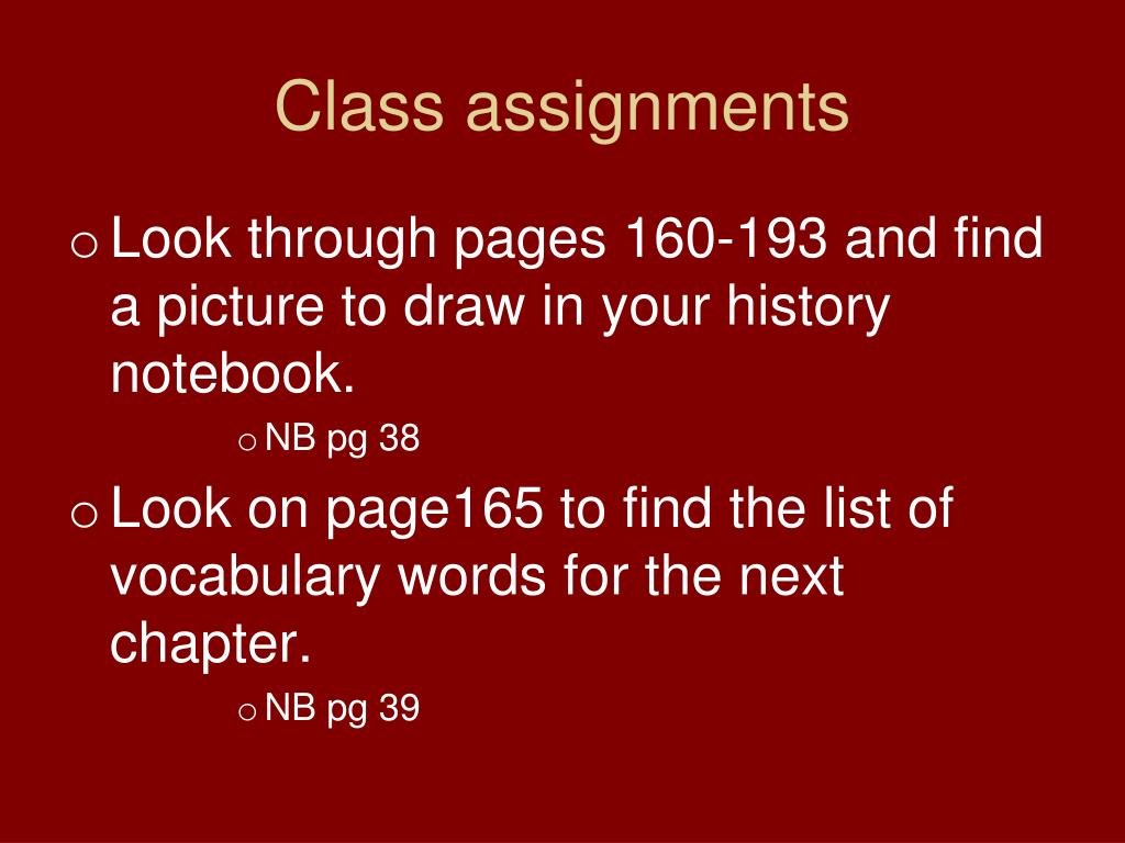 Class assignments • Look through pages 160-193 and find a picture to draw in your history notebook. • NB pg 38 • Look on page165 to find the list of vocabulary words for the next chapter. • NB pg 39