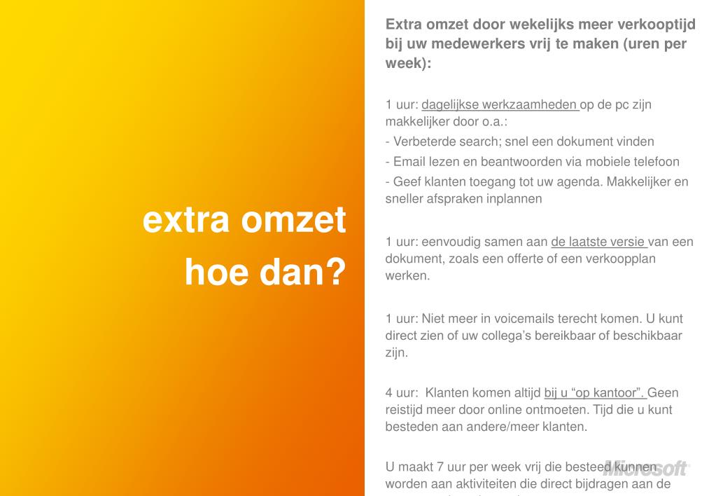 extra omzet hoe dan? Extra omzet door wekelijks meer verkooptijd bij uw medewerkers vrij te maken (uren per week): 1 uur: dagelijkse werkzaamheden op de pc zijn makkelijker door o.a.: - Verbeterde search; snel een dokument vinden - Email lezen en beantwoorden via mobiele telefoon - Geef klanten toegang tot uw agenda. Makkelijker en sneller afspraken inplannen 1 uur: eenvoudig samen aan de laatste versie van een dokument, zoals een offerte of een verkoopplan werken. 1 uur: Niet meer in voicemails terecht komen. U kunt direct zien of uw collega’s bereikbaar of beschikbaar zijn. 4 uur: Klanten komen altijd bij u “op kantoor”. Geen reistijd meer door online ontmoeten. Tijd die u kunt besteden aan andere/meer klanten. U maakt 7 uur per week vrij die besteed kunnen worden aan aktiviteiten die direct bijdragen aan de omzet, zoals verkooptaken. .