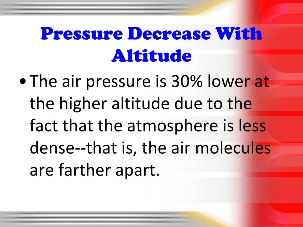 Pressure Decrease With Altitude • The air pressure is 30% lower at the higher altitude due to the fact that the atmosphere is less dense--that is, the air molecules are farther apart.
