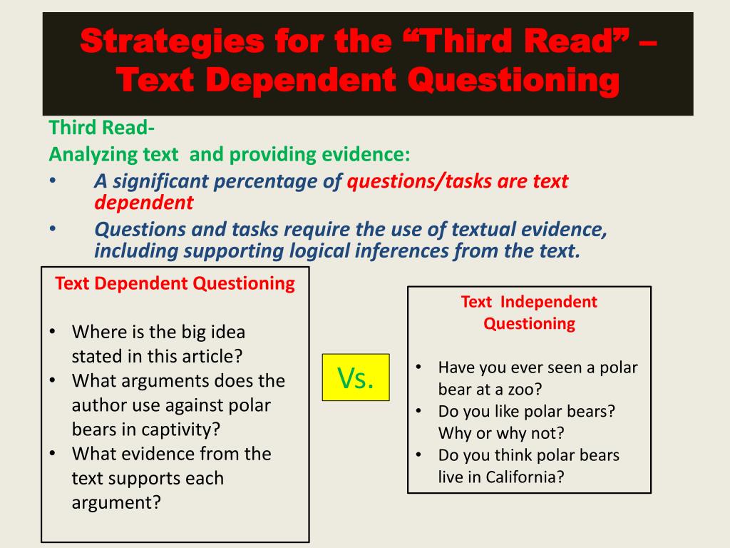 Strategies for the “Third Read” – Text Dependent Questioning Third Read- Analyzing text and providing evidence: • A significant percentage of questions/tasks are text dependent • Questions and tasks require the use of textual evidence, including supporting logical inferences from the text. • Text Dependent Questioning • Where is the big idea stated in this article? • What arguments does the author use against polar bears in captivity? • What evidence from the text supports each argument? • Text Independent Questioning • Have you ever seen a polar bear at a zoo? • Do you like polar bears? Why or why not? • Do you think polar bears live in California? Vs.