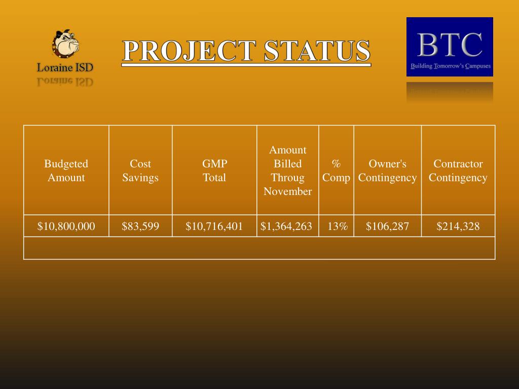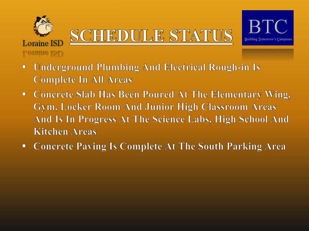 Loraine Independent School District. Campus Improvements Construction Update December 17 , 2012. PROJECT STATUS. PLANS. PLANS. SCHEDULE. SCHEDULE STATUS. Underground Plumbing And Electrical Rough-in Is Complete In All Areas