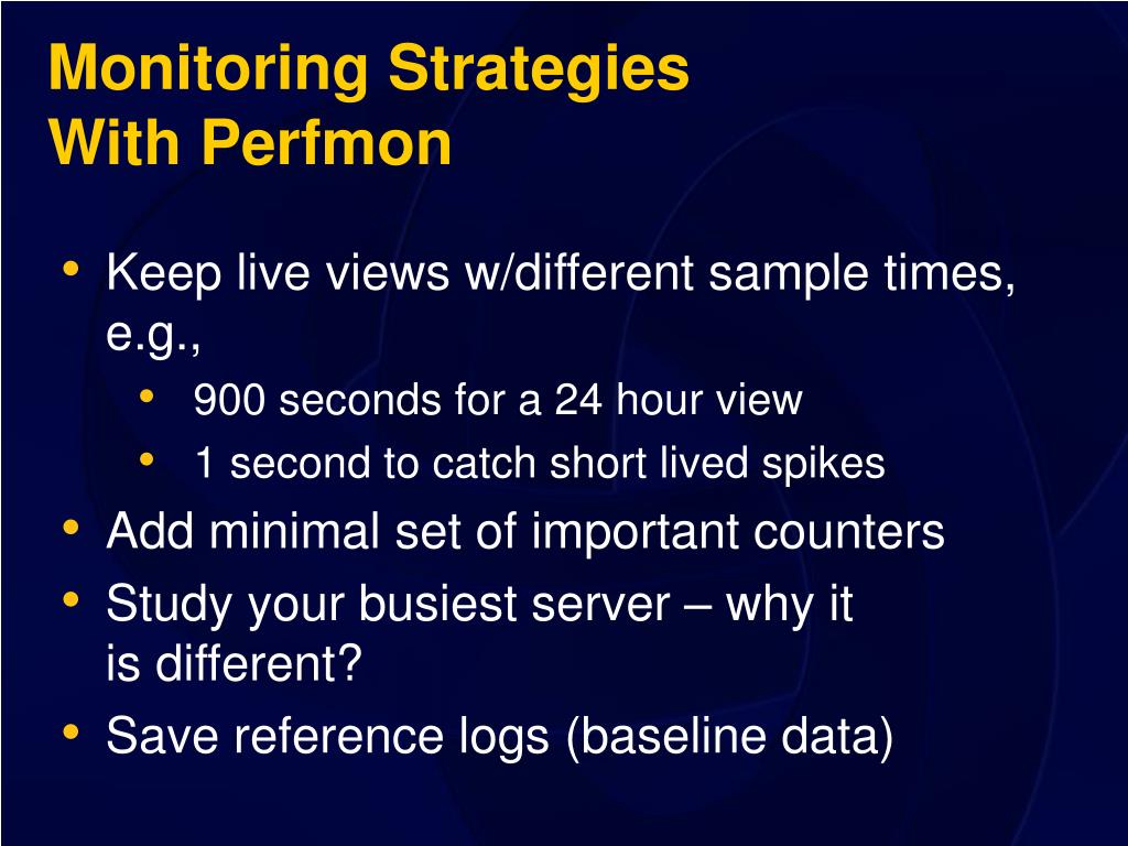 Monitoring Strategies With Perfmon • Keep live views w/different sample times, e.g., • 900 seconds for a 24 hour view • 1 second to catch short lived spikes • Add minimal set of important counters • Study your busiest server – why it is different? • Save reference logs (baseline data)
