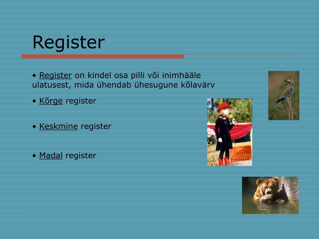 Register • Register on kindel osa pilli või inimhääle ulatusest, mida ühendab ühesugune kõlavärv • Kõrge register • Keskmine register • Madal register