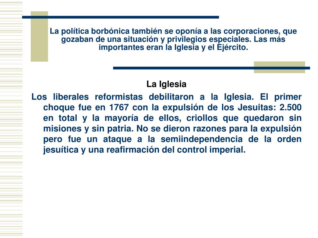 La política borbónica también se oponía a las corporaciones, que gozaban de una situación y privilegios especiales. Las más importantes eran la Iglesia y el Ejército. La Iglesia Los liberales reformistas debilitaron a la Iglesia. El primer choque fue en 1767 con la expulsión de los Jesuitas: 2.500 en total y la mayoría de ellos, criollos que quedaron sin misiones y sin patria. No se dieron razones para la expulsión pero fue un ataque a la semiindependencia de la orden jesuítica y una reafirmación del control imperial.