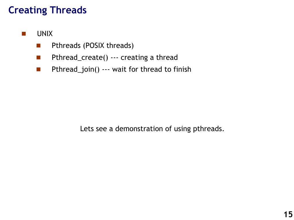 Creating Threads • UNIX • Pthreads (POSIX threads) • Pthread_create() --- creating a thread • Pthread_join() --- wait for thread to finish • Lets see a demonstration of using pthreads.