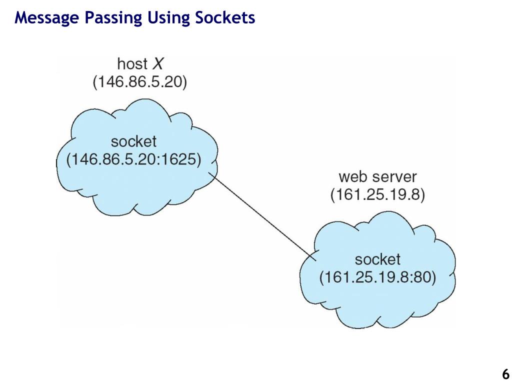 Message Passing Using Sockets A socket is defined as an endpoint for communication Concatenation of IP address and port The socket 161.25.19.8:1625 refers to port 1625 on host 161.25.19.8 Communication consists between a pair of sockets
