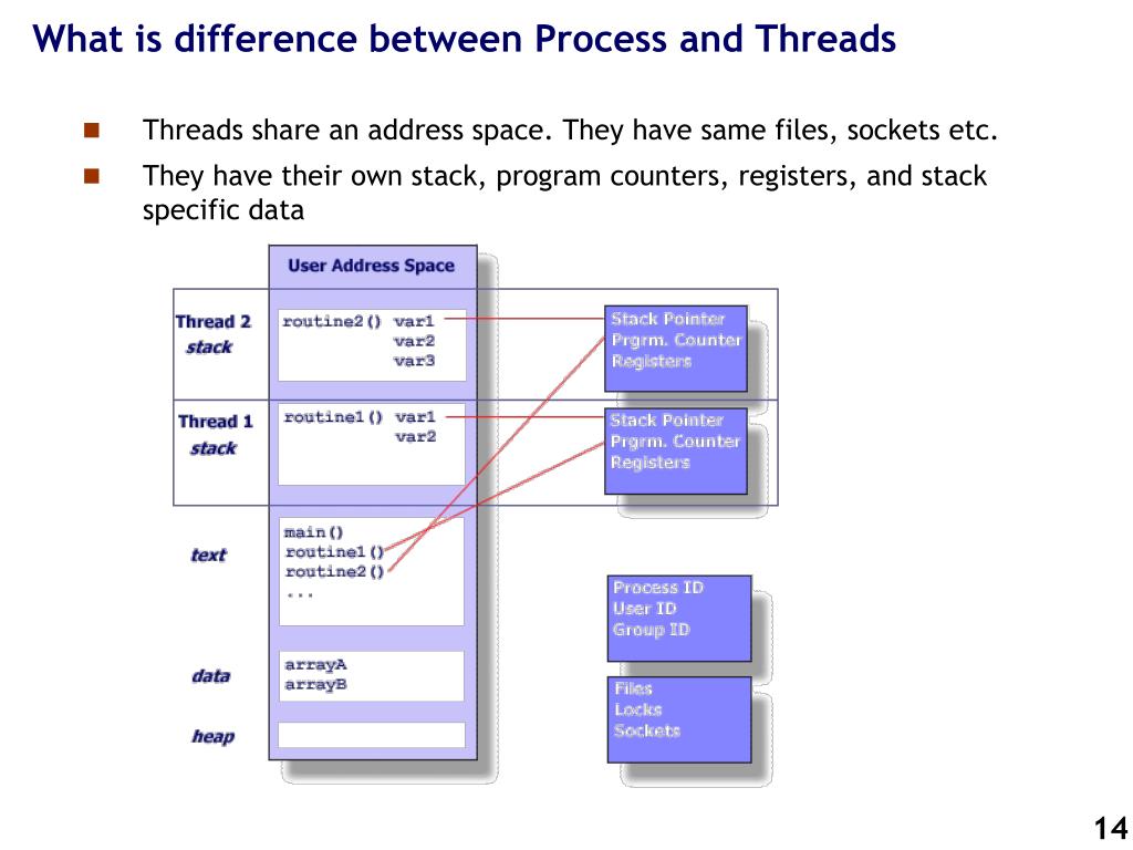 What is difference between Process and Threads • Threads share an address space. They have same files, sockets etc. • They have their own stack, program counters, registers, and stack specific data