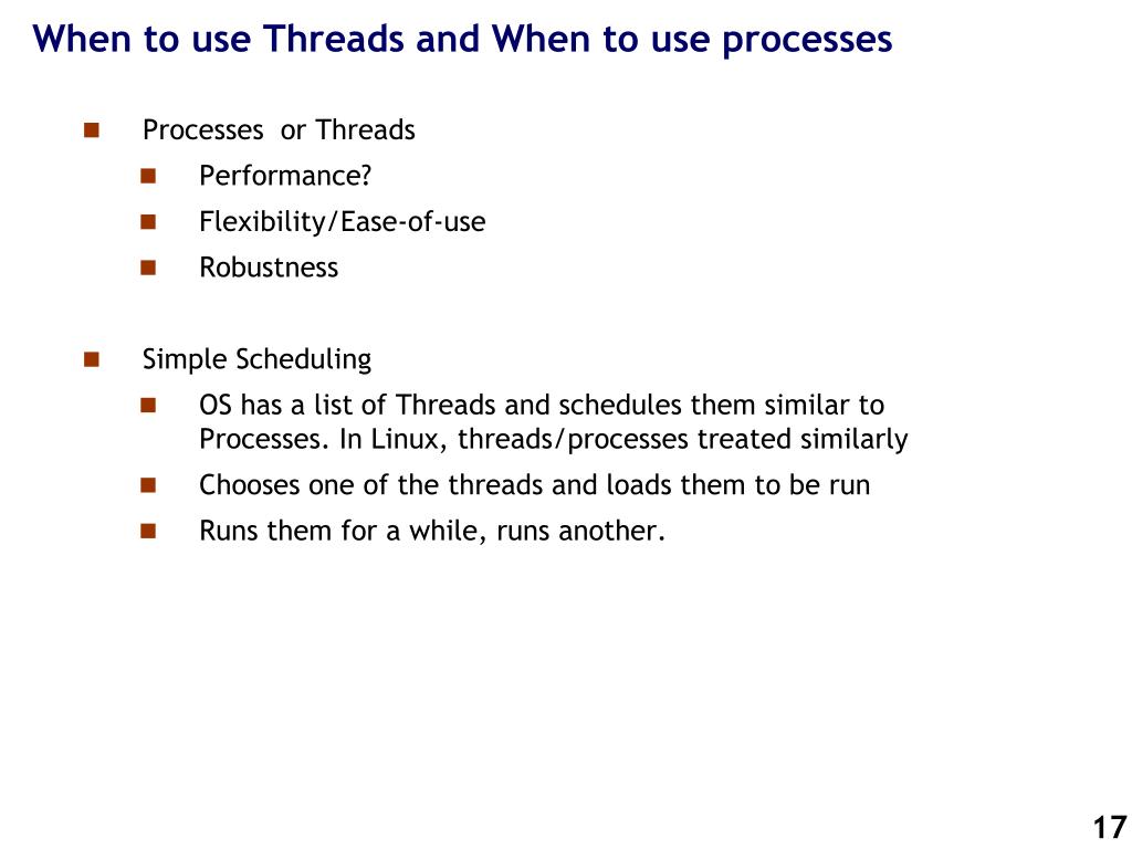 When to use Threads and When to use processes • Processes or Threads • Performance? • Flexibility/Ease-of-use • Robustness • Simple Scheduling • OS has a list of Threads and schedules them similar to Processes. In Linux, threads/processes treated similarly • Chooses one of the threads and loads them to be run • Runs them for a while, runs another.