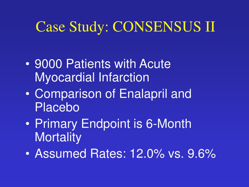 Case Study: CONSENSUS II • 9000 Patients with Acute Myocardial Infarction • Comparison of Enalapril and Placebo • Primary Endpoint is 6-Month Mortality • Assumed Rates: 12.0% vs. 9.6%