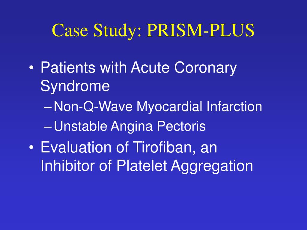 Case Study: PRISM-PLUS • Patients with Acute Coronary Syndrome • Non-Q-Wave Myocardial Infarction • Unstable Angina Pectoris • Evaluation of Tirofiban, an Inhibitor of Platelet Aggregation
