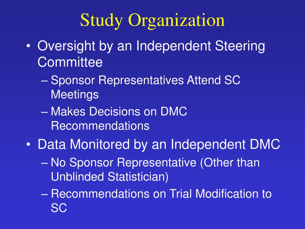 Study Organization • Oversight by an Independent Steering Committee • Sponsor Representatives Attend SC Meetings • Makes Decisions on DMC Recommendations • Data Monitored by an Independent DMC • No Sponsor Representative (Other than Unblinded Statistician) • Recommendations on Trial Modification to SC