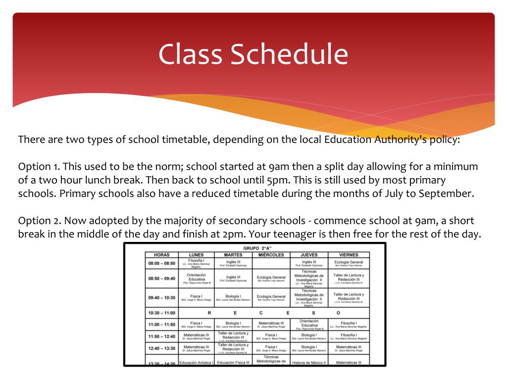 Class Schedule There are two types of school timetable, depending on the local Education Authority's policy: Option 1. This used to be the norm; school started at 9am then a split day allowing for a minimum of a two hour lunch break. Then back to school until 5pm. This is still used by most primary schools. Primary schools also have a reduced timetable during the months of July to September. Option 2. Now adopted by the majority of secondary schools - commence school at 9am, a short break in the middle of the day and finish at 2pm. Your teenager is then free for the rest of the day.