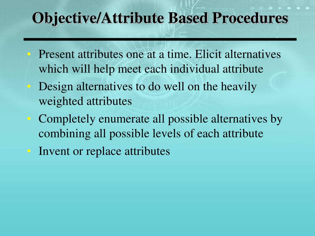 Objective/Attribute Based Procedures • Present attributes one at a time. Elicit alternatives which will help meet each individual attribute • Design alternatives to do well on the heavily weighted attributes • Completely enumerate all possible alternatives by combining all possible levels of each attribute • Invent or replace attributes