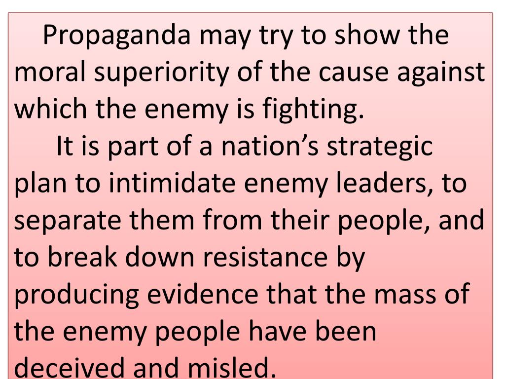 Propaganda may try to show the moral superiority of the cause against which the enemy is fighting. It is part of a nation’s strategic plan to intimidate enemy leaders, to separate them from their people, and to break down resistance by producing evidence that the mass of the enemy people have been deceived and misled.