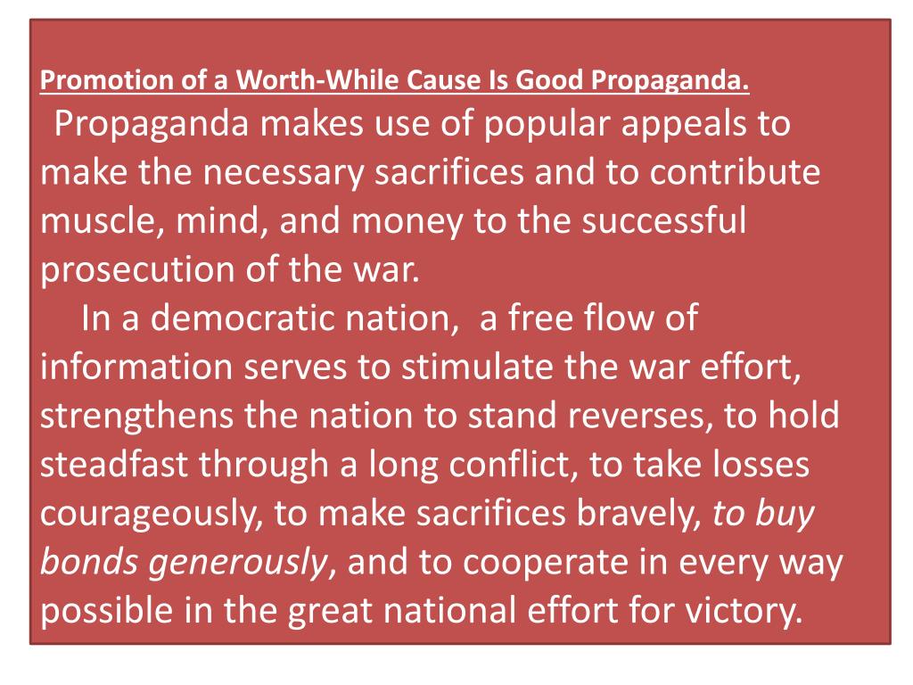 Promotion of a Worth-While Cause Is Good Propaganda. Propaganda makes use of popular appeals to make the necessary sacrifices and to contribute muscle, mind, and money to the successful prosecution of the war. In a democratic nation, a free flow of information serves to stimulate the war effort, strengthens the nation to stand reverses, to hold steadfast through a long conflict, to take losses courageously, to make sacrifices bravely, to buy bonds generously, and to cooperate in every way possible in the great national effort for victory.