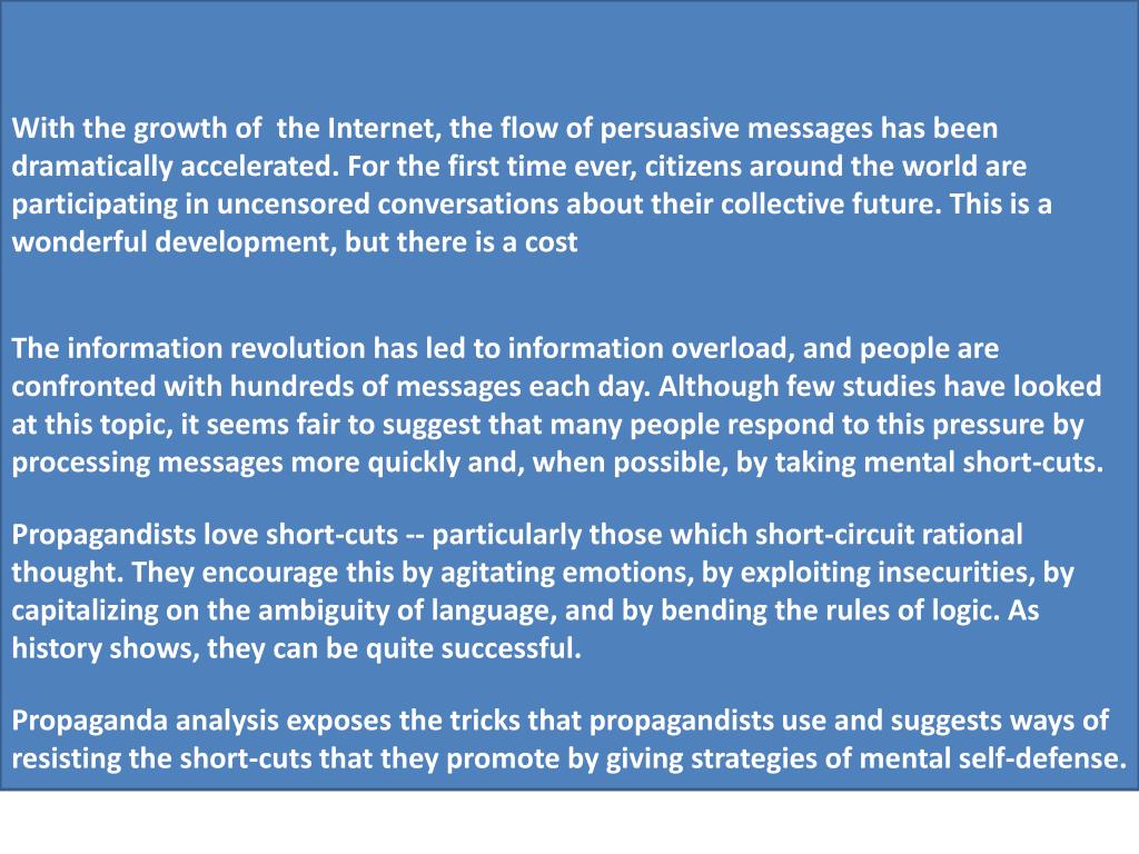 With the growth of the Internet, the flow of persuasive messages has been dramatically accelerated. For the first time ever, citizens around the world are participating in uncensored conversations about their collective future. This is a wonderful development, but there is a cost The information revolution has led to information overload, and people are confronted with hundreds of messages each day. Although few studies have looked at this topic, it seems fair to suggest that many people respond to this pressure by processing messages more quickly and, when possible, by taking mental short-cuts.Propagandists love short-cuts -- particularly those which short-circuit rational thought. They encourage this by agitating emotions, by exploiting insecurities, by capitalizing on the ambiguity of language, and by bending the rules of logic. As history shows, they can be quite successful.Propaganda analysis exposes the tricks that propagandists use and suggests ways of resisting the short-cuts that they promote by giving strategies of mental self-defense.