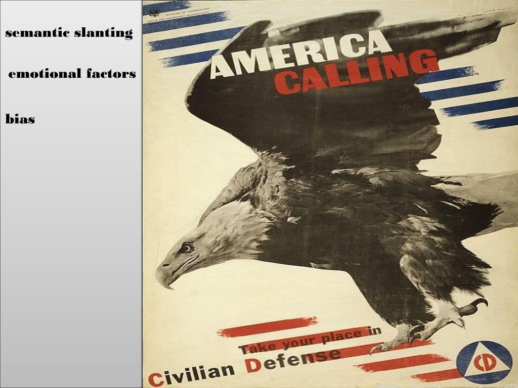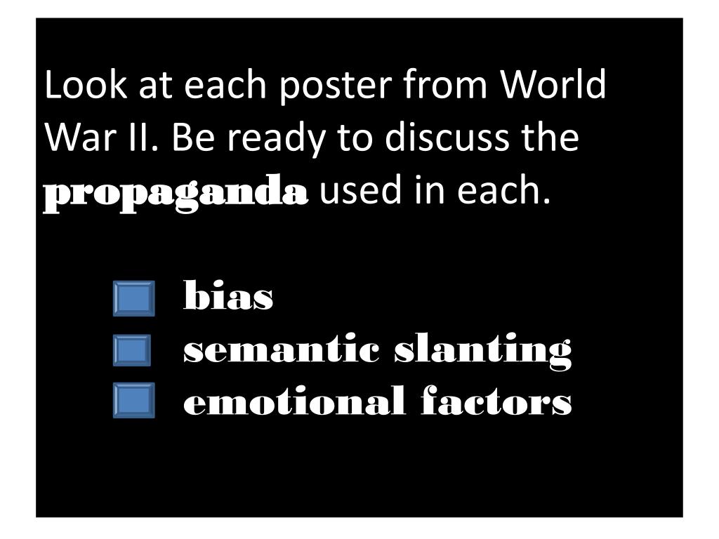 Look at each poster from World War II. Be ready to discuss the propaganda used in each.biassemantic slantingemotional factors