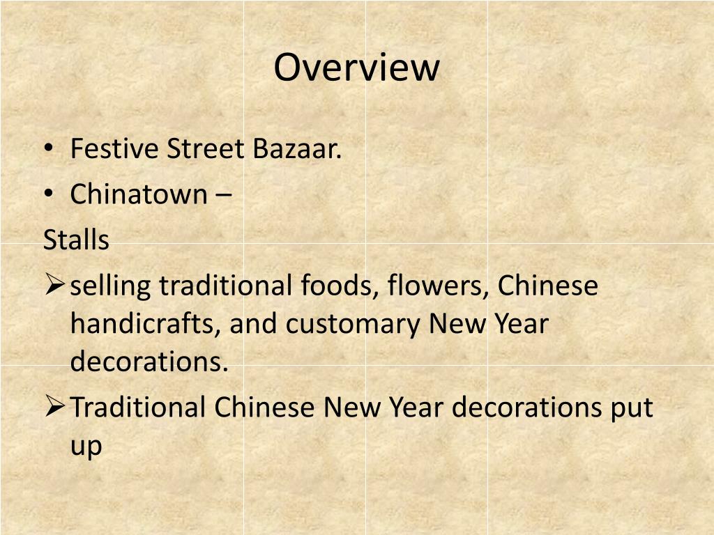 Overview • Festive Street Bazaar. • Chinatown – Stalls • selling traditional foods, flowers, Chinese handicrafts, and customary New Year decorations. • Traditional Chinese New Year decorations put up