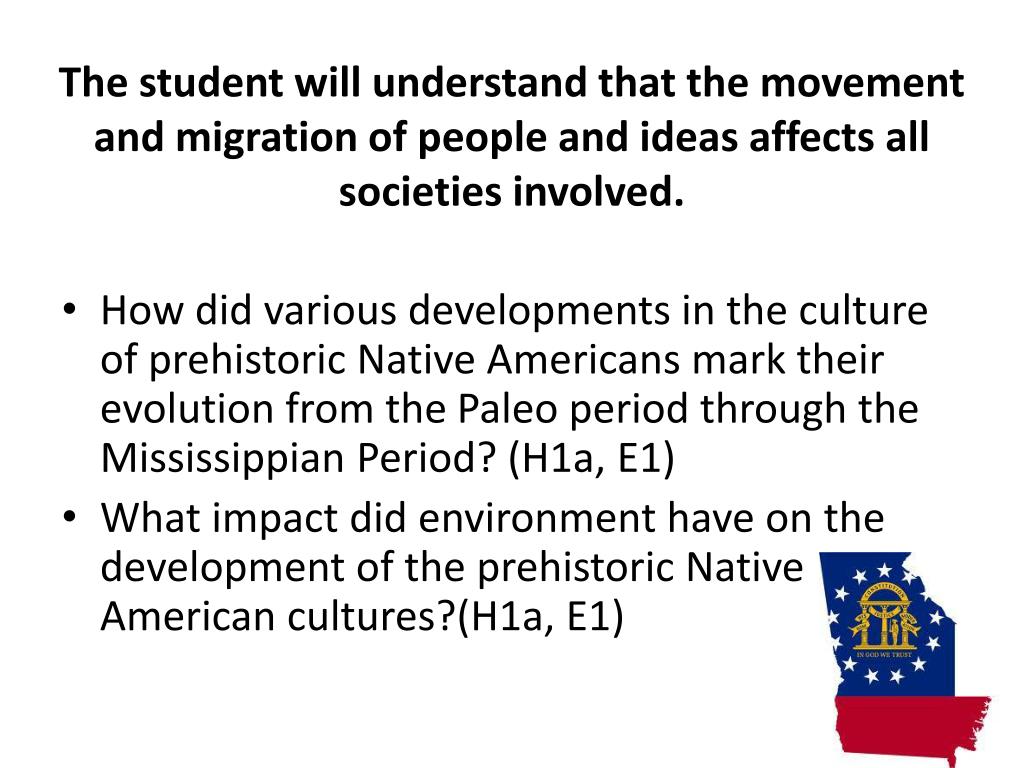 The student will understand that the movement and migration of people and ideas affects all societies involved. • How did various developments in the culture of prehistoric Native Americans mark their evolution from the Paleo period through the Mississippian Period? (H1a, E1) • What impact did environment have on the development of the prehistoric Native American cultures?(H1a, E1)