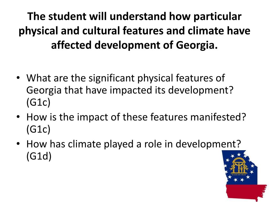 The student will understand how particular physical and cultural features and climate have affected development of Georgia. • What are the significant physical features of Georgia that have impacted its development? (G1c) • How is the impact of these features manifested? (G1c) • How has climate played a role in development? (G1d)