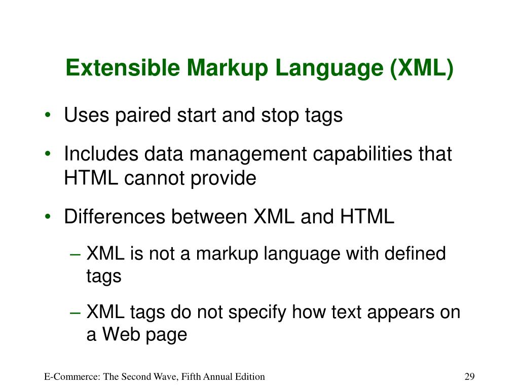 Extensible Markup Language (XML) • Uses paired start and stop tags • Includes data management capabilities that HTML cannot provide • Differences between XML and HTML • XML is not a markup language with defined tags • XML tags do not specify how text appears on a Web page E-Commerce: The Second Wave, Fifth Annual Edition