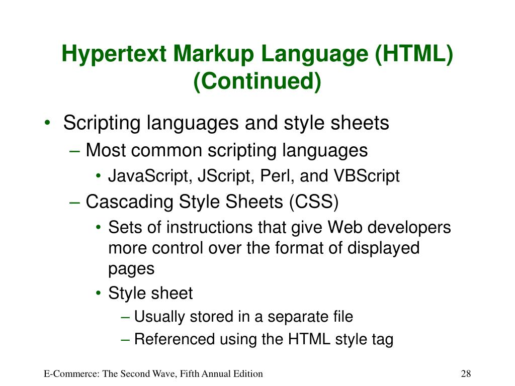 Hypertext Markup Language (HTML) (Continued) • Scripting languages and style sheets • Most common scripting languages • JavaScript, JScript, Perl, and VBScript • Cascading Style Sheets (CSS) • Sets of instructions that give Web developers more control over the format of displayed pages • Style sheet • Usually stored in a separate file • Referenced using the HTML style tag E-Commerce: The Second Wave, Fifth Annual Edition