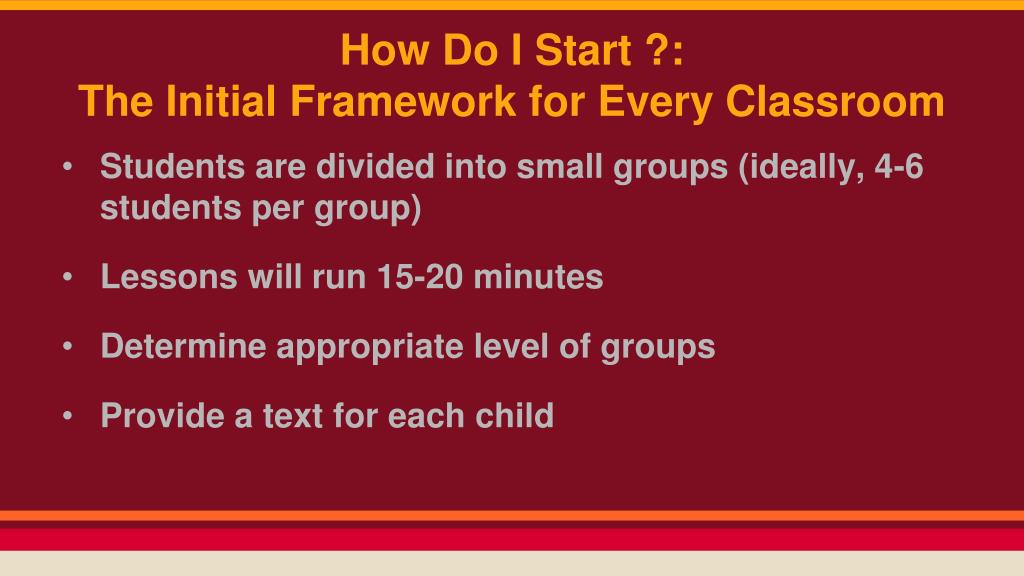 How Do I Start ?: The Initial Framework for Every Classroom • Students are divided into small groups (ideally, 4-6 students per group) • Lessons will run 15-20 minutes • Determine appropriate level of groups • Provide a text for each child