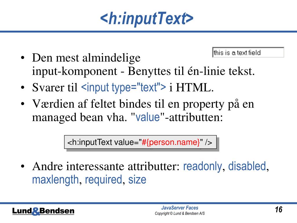 <h:inputText> • Den mest almindeligeinput-komponent - Benyttes til én-linie tekst. • Svarer til <input type="text"> i HTML. • Værdien af feltet bindes til en property på en managed bean vha. "value"-attributten: • Andre interessante attributter: readonly, disabled, maxlength, required, size <h:inputText value="#{person.name}" />