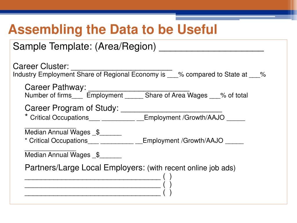Assembling the Data to be Useful Sample Template: (Area/Region) ___________________ Career Cluster: ______________________Industry Employment Share of Regional Economy is ___% compared to State at ___% Career Pathway: ______________________Number of firms___ Employment _____ Share of Area Wages ___% of total Career Program of Study: ______________________* Critical Occupations___ _________ __Employment /Growth/AAJO _____ ______________Median Annual Wages _$______ * Critical Occupations___ _________ __Employment /Growth/AAJO _____ ______________Median Annual Wages _$______ Partners/Large Local Employers: (with recent online job ads)_________________________________ ( )_________________________________ ( )_________________________________ ( )