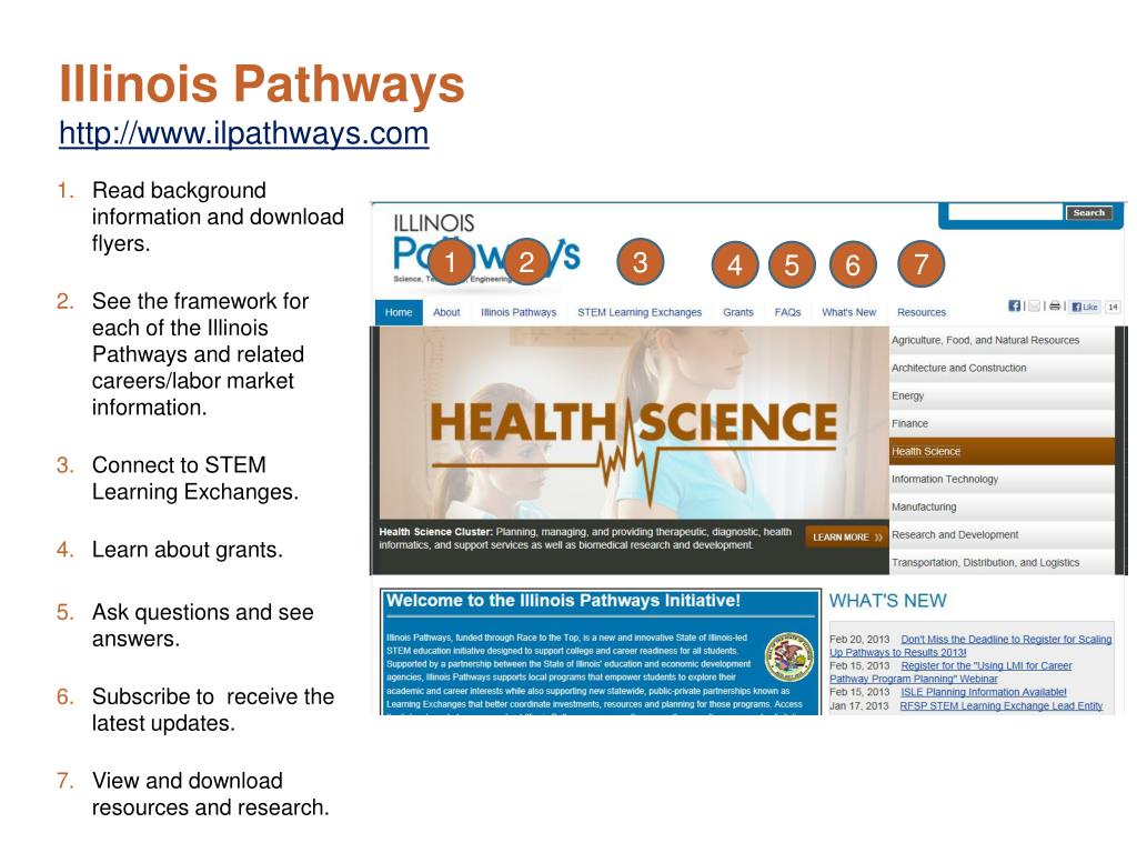 Illinois Pathwayshttp://www.ilpathways.com Read background information and download flyers. See the framework for each of the Illinois Pathways and related careers/labor market information. Connect to STEM Learning Exchanges. Learn about grants. Ask questions and see answers. Subscribe to receive the latest updates. View and download resources and research. 1 2 3 7 6 4 5