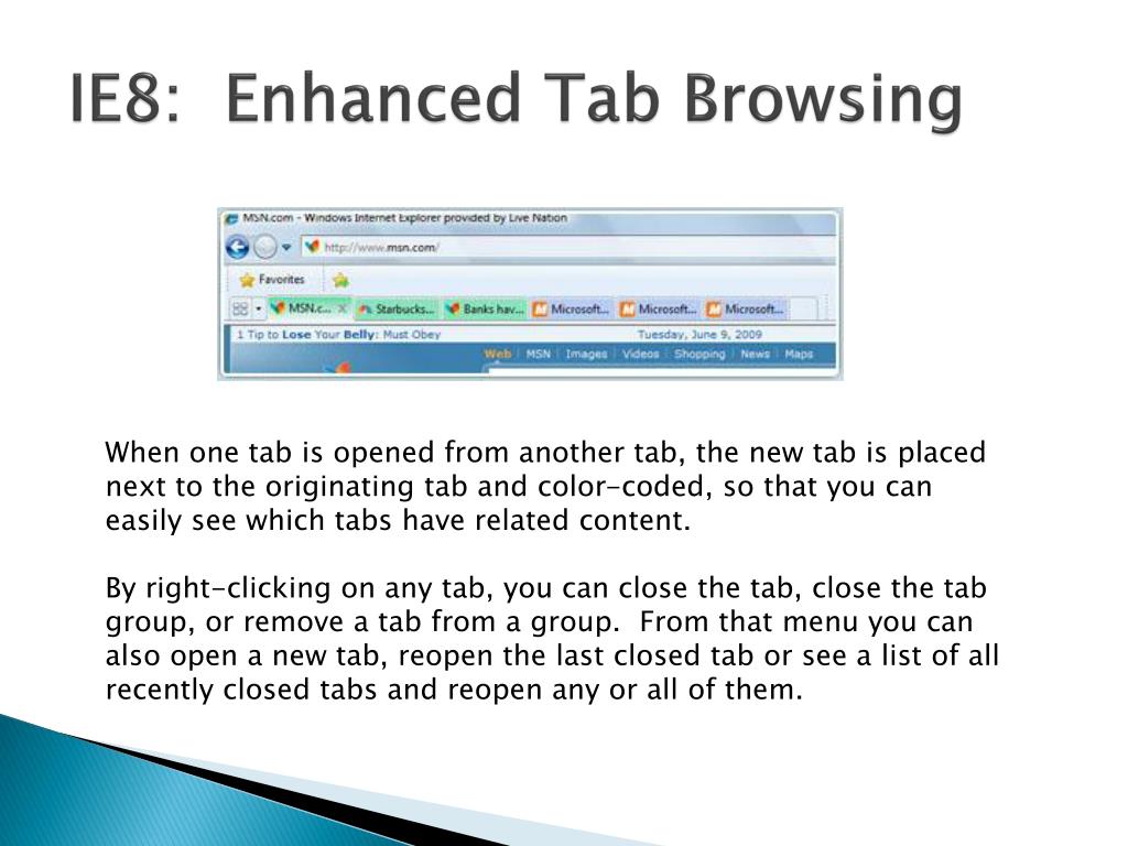 IE8: Enhanced Tab Browsing When one tab is opened from another tab, the new tab is placed next to the originating tab and color-coded, so that you can easily see which tabs have related content. By right-clicking on any tab, you can close the tab, close the tab group, or remove a tab from a group. From that menu you can also open a new tab, reopen the last closed tab or see a list of all recently closed tabs and reopen any or all of them.