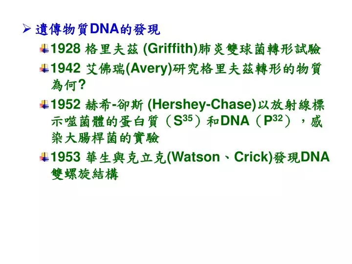 遺傳物質DNA的發現 • 1928 格里夫茲 (Griffith)肺炎雙球菌轉形試驗 • 1942 艾佛瑞(Avery)研究格里夫茲轉形的物質為何? • 1952 赫希-卻斯 (Hershey-Chase)以放射線標示噬菌體的蛋白質(S35)和DNA(P32),感染大腸桿菌的實驗 • 1953 華生與克立克(Watson、Crick)發現DNA雙螺旋結構