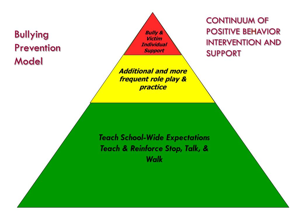 CONTINUUM OF POSITIVE BEHAVIOR INTERVENTION AND SUPPORT Bullying Prevention Model Bully & Victim Individual Support Additional and more frequent role play & practice Teach School-Wide Expectations Teach & Reinforce Stop, Talk, & Walk