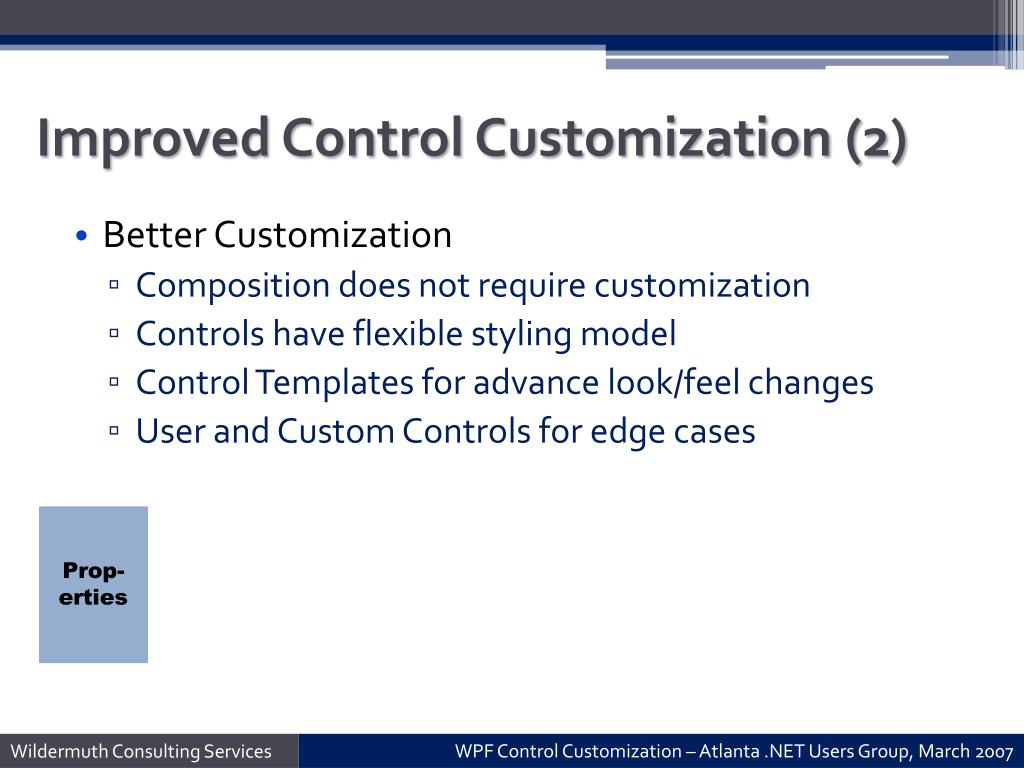 Improved Control Customization • GDI Challenges • Controls are not flexible • Properties are the path to customization • Owner-drawing controls are expensive • Advanced customization requires significantly more work.
