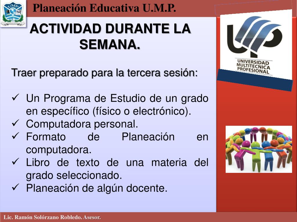 Planeación Educativa U.M.P. • ACTIVIDAD DURANTE LA SEMANA. • Traer preparado para la tercera sesión: • Un Programa de Estudio de un grado en específico (físico o electrónico). • Computadora personal. • Formato de Planeación en computadora. • Libro de texto de una materia del grado seleccionado. • Planeación de algún docente. Lic. Ramón Solórzano Robledo. Asesor.