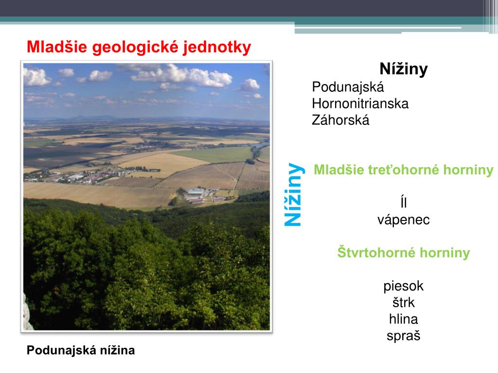 Mladšie geologické jednotky Nížiny Nížiny Podunajská Hornonitrianska Záhorská Mladšie treťohorné horniny Íl vápenec Štvrtohorné horniny piesok štrk hlina spraš Podunajská nížina