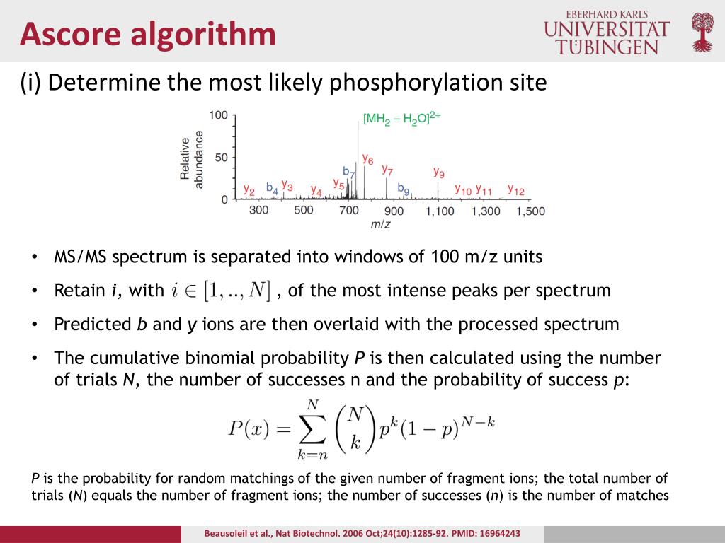 Ascore algorithm (i) Determine the most likely phosphorylation site • MS/MS spectrum is separated into windows of 100 m/z units • Retain i, with , of the most intense peaks per spectrum • Predicted b and y ions are then overlaid with the processed spectrum • The cumulative binomial probability P is then calculated using the number of trials N, the number of successes n and the probability of success p: • P is the probability for random matchings of the given number of fragment ions; the total number of trials (N) equals the number of fragment ions; the number of successes (n) is the number of matches Beausoleil et al., Nat Biotechnol. 2006 Oct;24(10):1285-92. PMID: 16964243