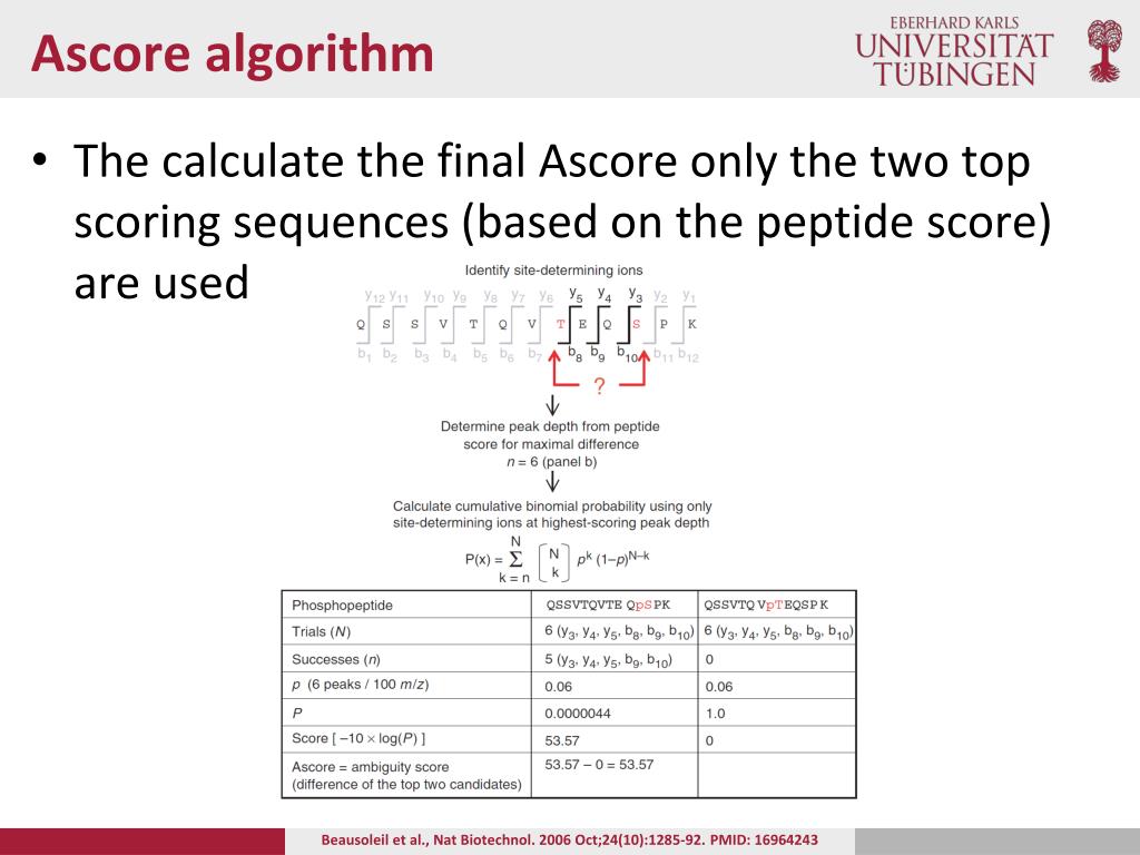 Ascore algorithm • The calculate the final Ascore only the two top scoring sequences (based on the peptide score) are used Beausoleil et al., Nat Biotechnol. 2006 Oct;24(10):1285-92. PMID: 16964243