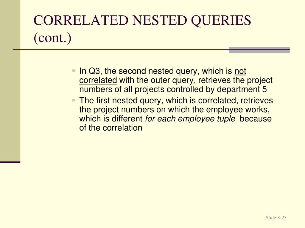 CORRELATED NESTED QUERIES (cont.) • In Q3, the second nested query, which is not correlated with the outer query, retrieves the project numbers of all projects controlled by department 5 • The first nested query, which is correlated, retrieves the project numbers on which the employee works, which is different for each employee tuple because of the correlation Slide 8-23