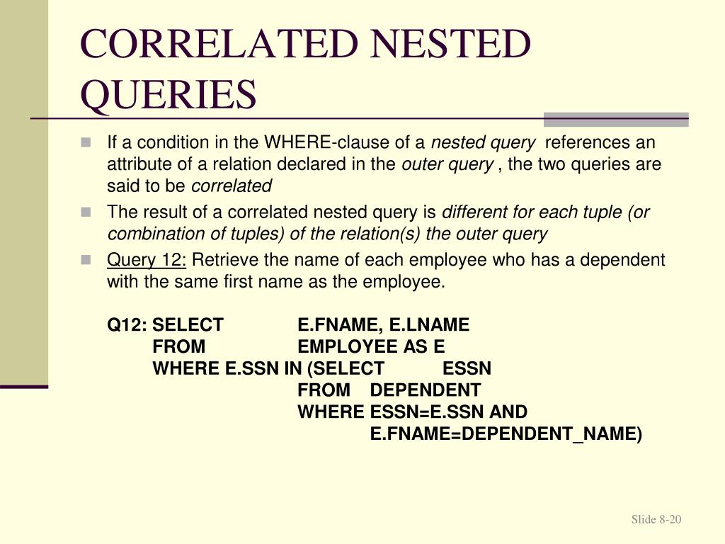 CORRELATED NESTED QUERIES If a condition in the WHERE-clause of a nested query references an attribute of a relation declared in the outer query , the two queries are said to be correlated The result of a correlated nested query is different for each tuple (or combination of tuples) of the relation(s) the outer query Query 12: Retrieve the name of each employee who has a dependent with the same first name as the employee.Q12: SELECT E.FNAME, E.LNAME FROM EMPLOYEE AS E WHERE E.SSN IN (SELECT ESSN FROM DEPENDENT WHERE ESSN=E.SSN AND E.FNAME=DEPENDENT_NAME) Slide 8-20