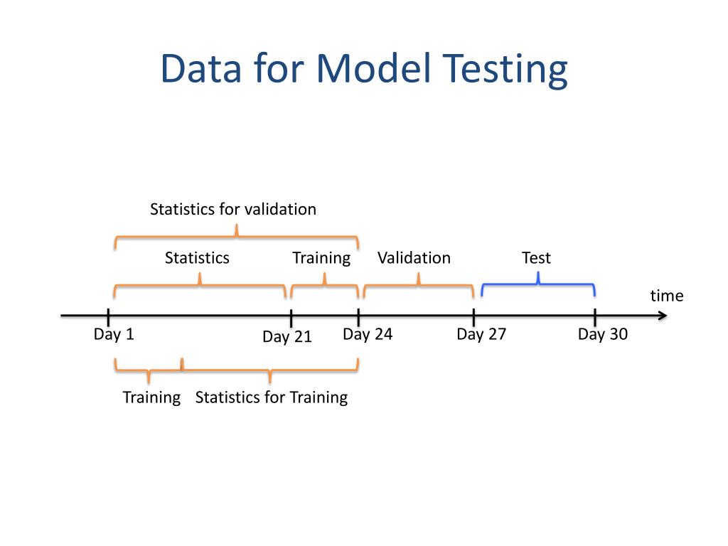 Data for Model Testing Statistics for validation Test Statistics Training Validation time Day 1 Day 24 Day 27 Day 30 Day 21 Training Statistics for Training