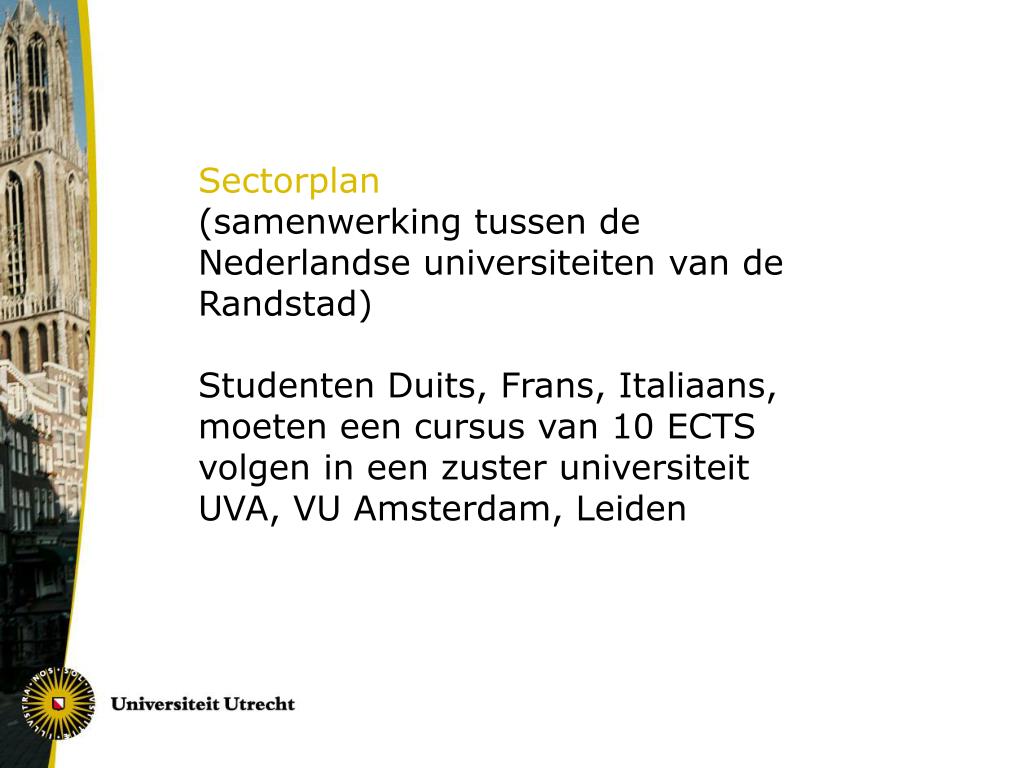 Sectorplan (samenwerking tussen de Nederlandse universiteiten van de Randstad) Studenten Duits, Frans, Italiaans, moeten een cursus van 10 ECTS volgen in een zuster universiteit UVA, VU Amsterdam, Leiden