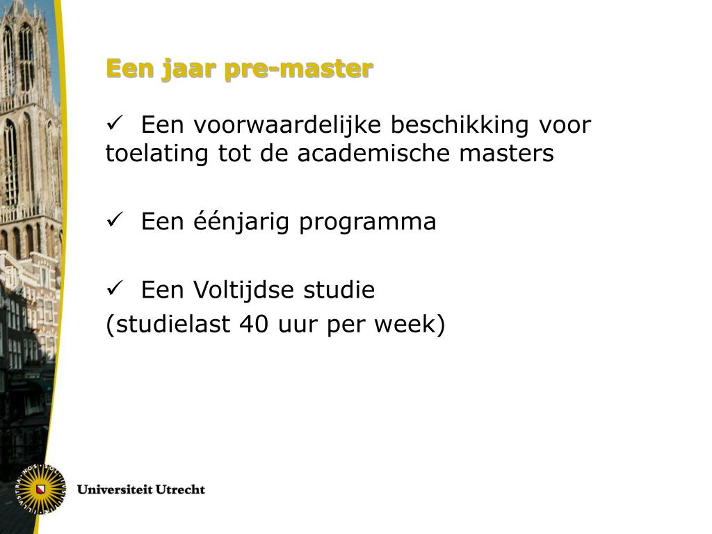 Een jaar pre-master • Een voorwaardelijke beschikking voor toelating tot de academische masters • Een éénjarig programma • Een Voltijdse studie (studielast 40 uur per week)