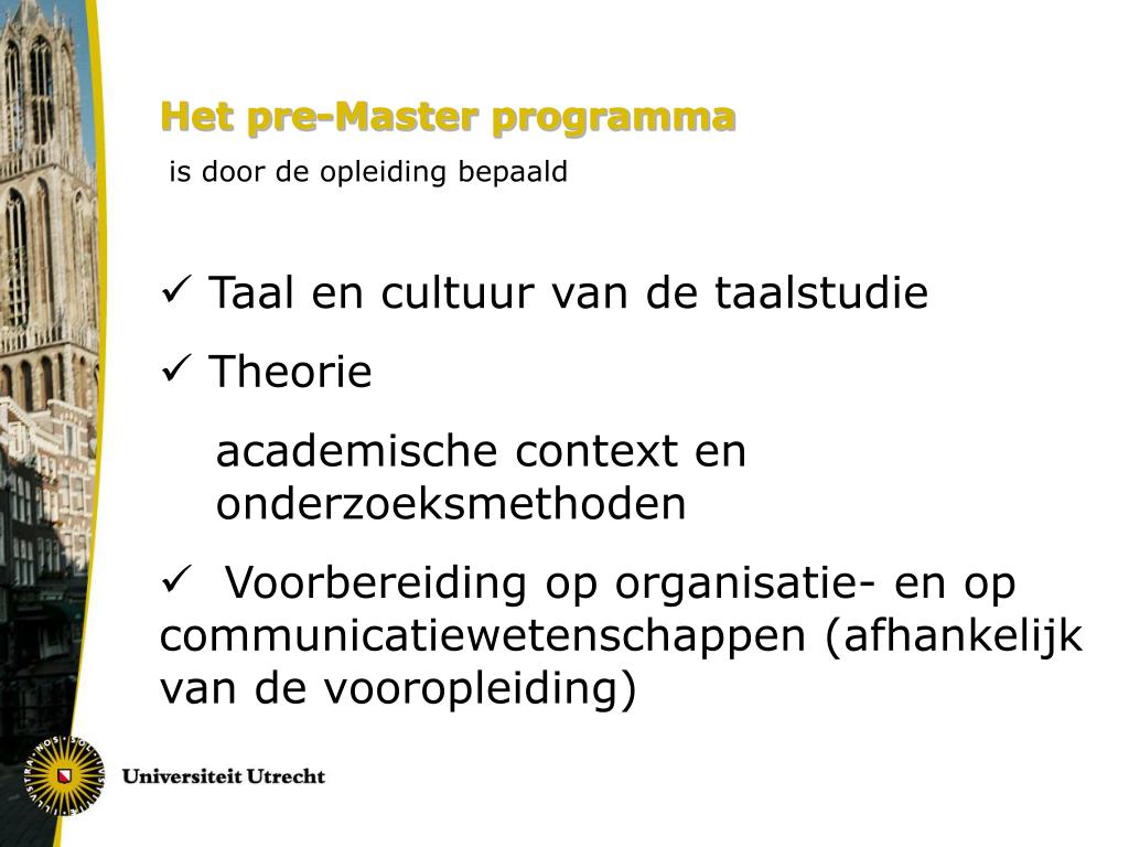 Het pre-Master programma • is door de opleiding bepaald • Taal en cultuur van de taalstudie • Theorie academische context en onderzoeksmethoden • Voorbereiding op organisatie- en op communicatiewetenschappen (afhankelijk van de vooropleiding)