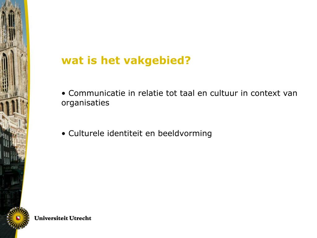 wat is het vakgebied? • Communicatie in relatie tot taal en cultuur in context van organisaties • Culturele identiteit en beeldvorming