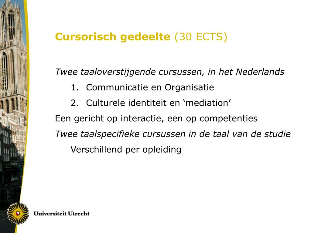 Cursorisch gedeelte (30 ECTS) • Twee taaloverstijgende cursussen, in het Nederlands • Communicatie en Organisatie • Culturele identiteit en ‘mediation’ • Een gericht op interactie, een op competenties • Twee taalspecifieke cursussen in de taal van de studie • Verschillend per opleiding